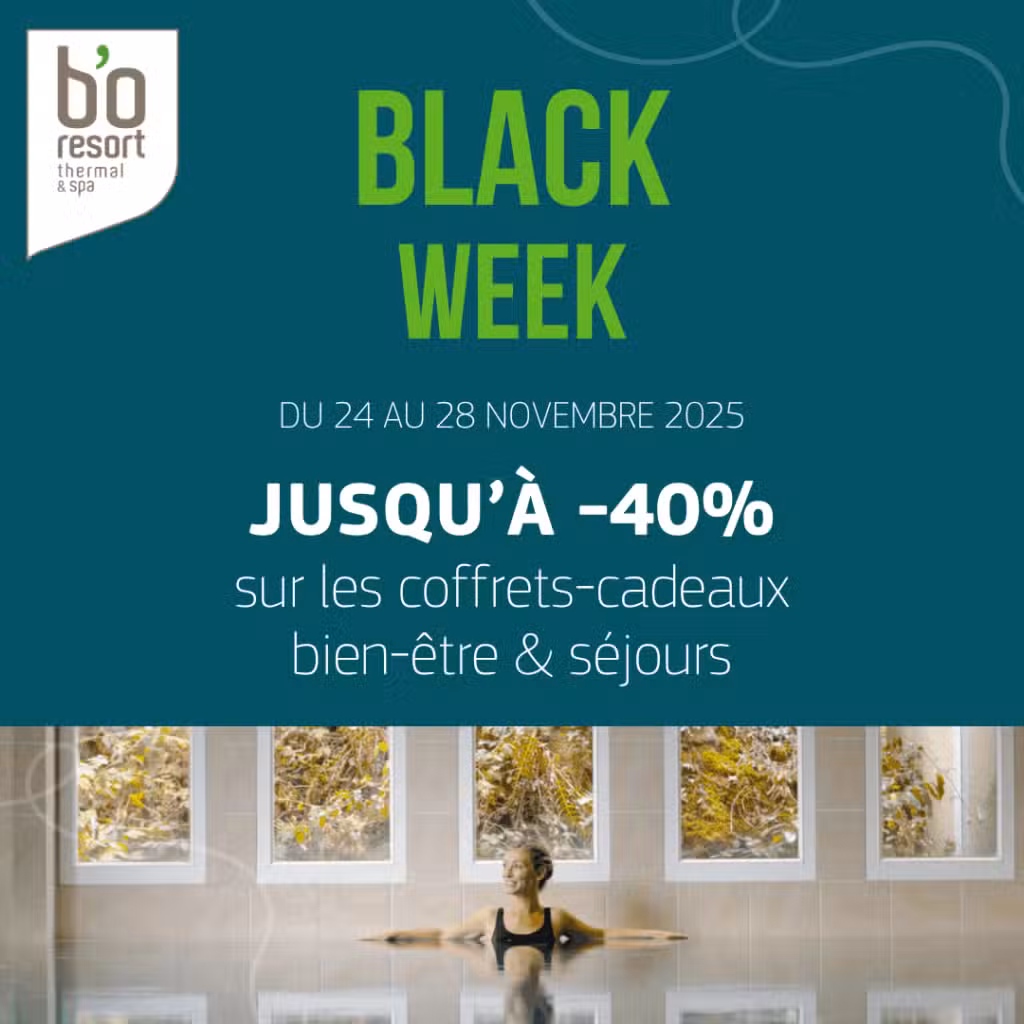 *BLACK FRIDAY = Vendredi noir. BLACK WEEK = semaine noire. Offres promotionnelles dédiées à l’ouverture de la période de fêtes. Profitez d’une remise de 40% sur le parcours liberté d’une demi-journée (stock limité). 20% de remise sur une sélection de parcours de soins et d’échappées, 10% de remise sur une sélection de rituels et séjours. Offre commerciale valable du 24 au 28 novembre 2025 inclus. Offre non cumulable avec d’autres offres en cours.